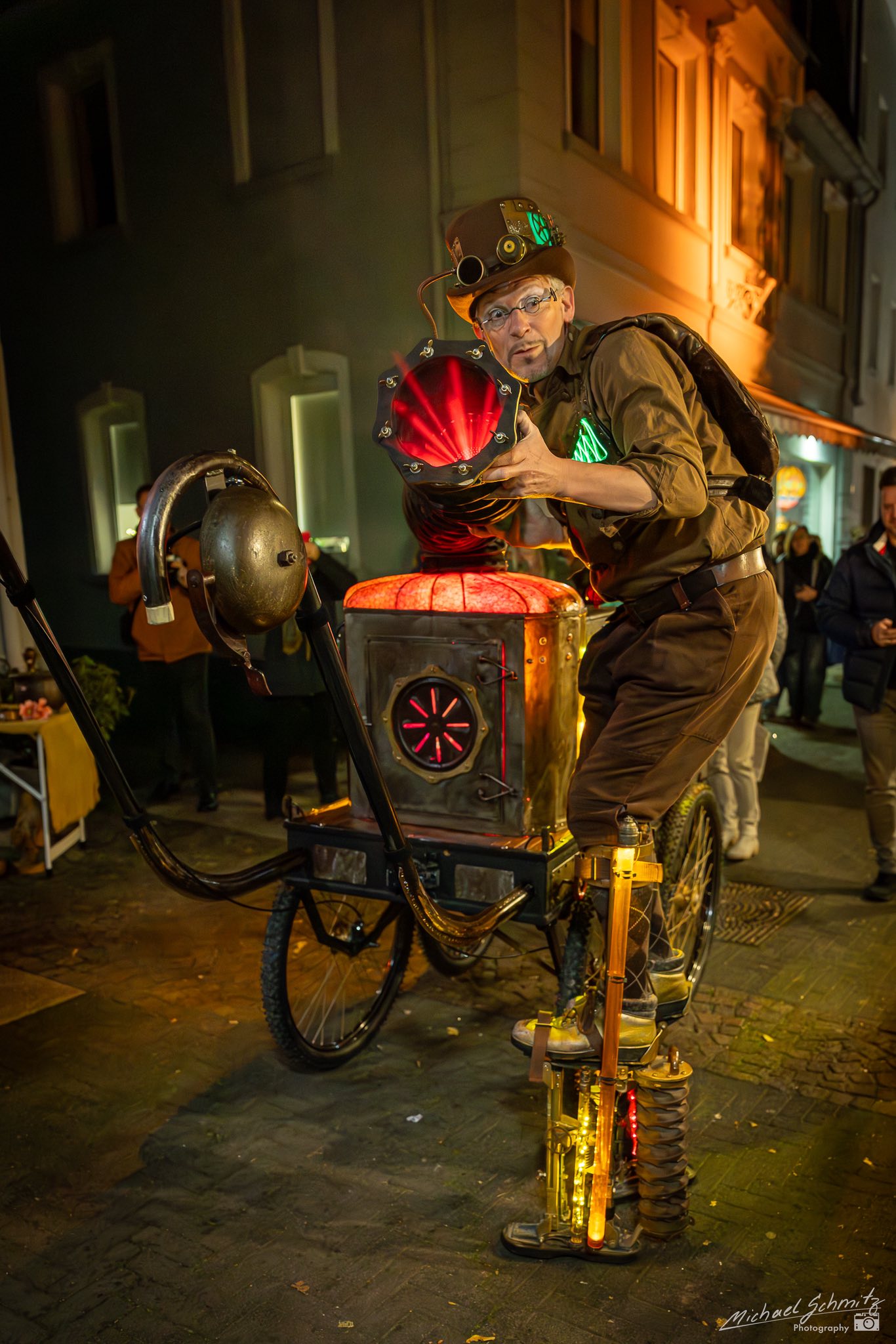 Mit seinem leuchtenden und dampfenden Gefährt Smoky 41 scheint Güstaf einer rätselhaft fremden und doch vertrauten Welt zu entstammen. Die Veranstaltungsbesucher:innen werden träumen und staunen, wenn Güstaf und Smoky ihre zauberhaften Lichtspiele entfachen. Inspiriert von der Begegnung mit dem Publikum lässt Güstaf in der Interaktion spie- lerisch immer wieder überraschende Momente außerhalb von Raum und Zeit ent- stehen – manchmal komisch, manchmal anrührend und manchmal einfach nur schön.
